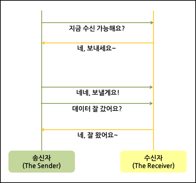 예시를 들어보자. 핀란드로 유학을 떠난 민수(수신자)는 한국 음식이 그리워졌다. 핀란드 친구들과 한국 음식 파티를 하기로 한다. 한인마트에서 잘 팔지 않는 식료품(데이터)은 한국에 있는 친동생 경수(송신자)에게 부탁한다(SYN). 경수의 성격은 나름대로 꼼꼼하고 완벽을 추구한다. 책임감이 강해서 맡은 것은 끝까지 다 처리한다. 다만 속도는 다소 느릴 때가 있다.