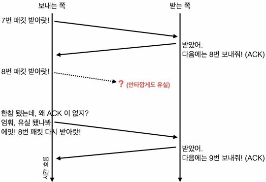 어라? 목록에서 팔도비빔면 소스와 골뱅이 통조림이 빠져있다. 두 개 택배 상자 중에 하나만 도착했나보다. 경수에게 목록에서 내가 이전에 말했던 식료품이 빠졌노라고 이야기 한다. (패킷 유실)
